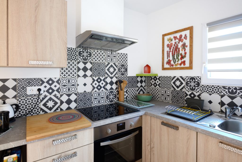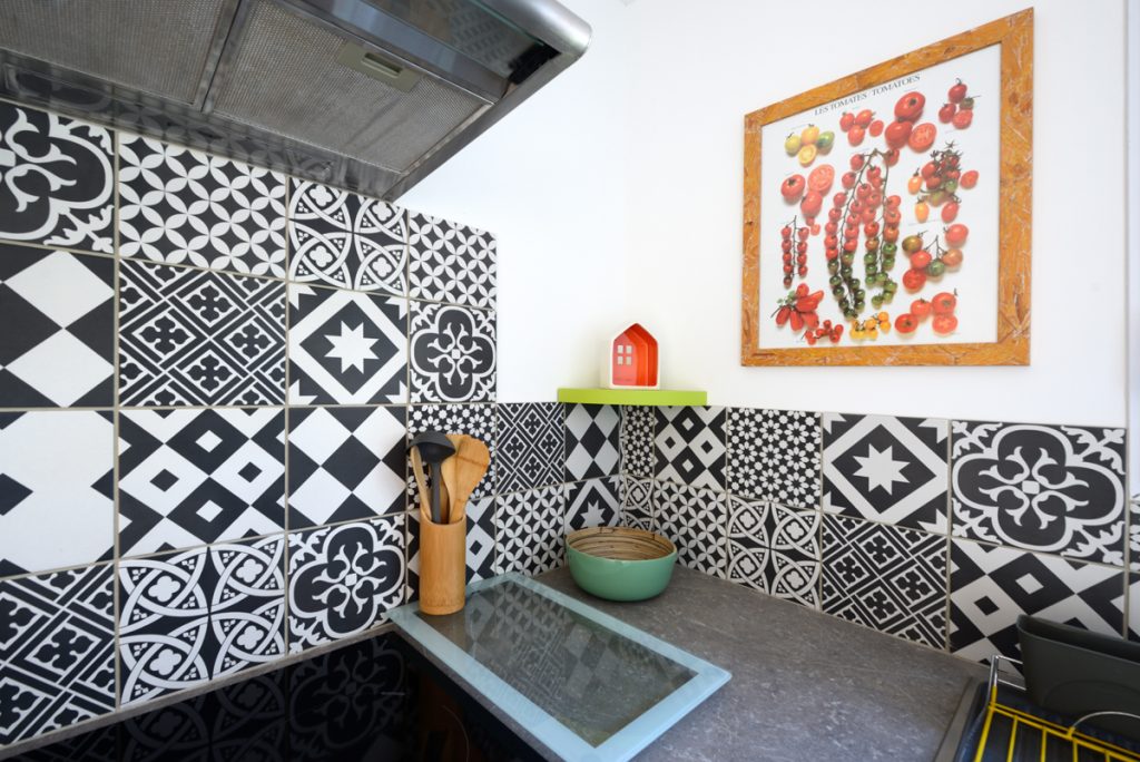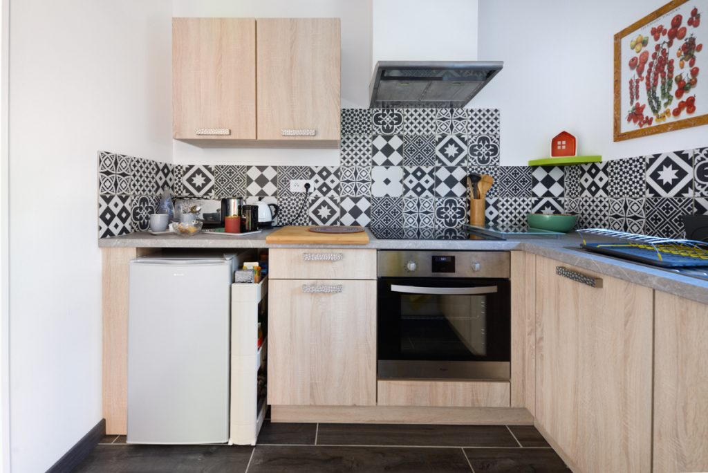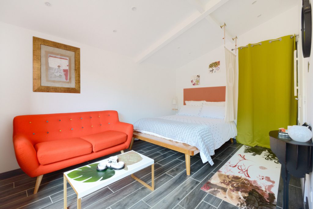 Il est composé d’une pièce à vivre avec un lit en 140, un coin salon avec canapé, une véritable cuisine équipée (four, plaque induction, réfrigérateur), table haute avec tabourets de bar. Il dispose d’une petite salle d’eau avec vasque et douche, les toilettes sont indépendantes Le studio est ouvert sur un jardin cour privatif avec terrasse de 50m² avec salon de jardin.